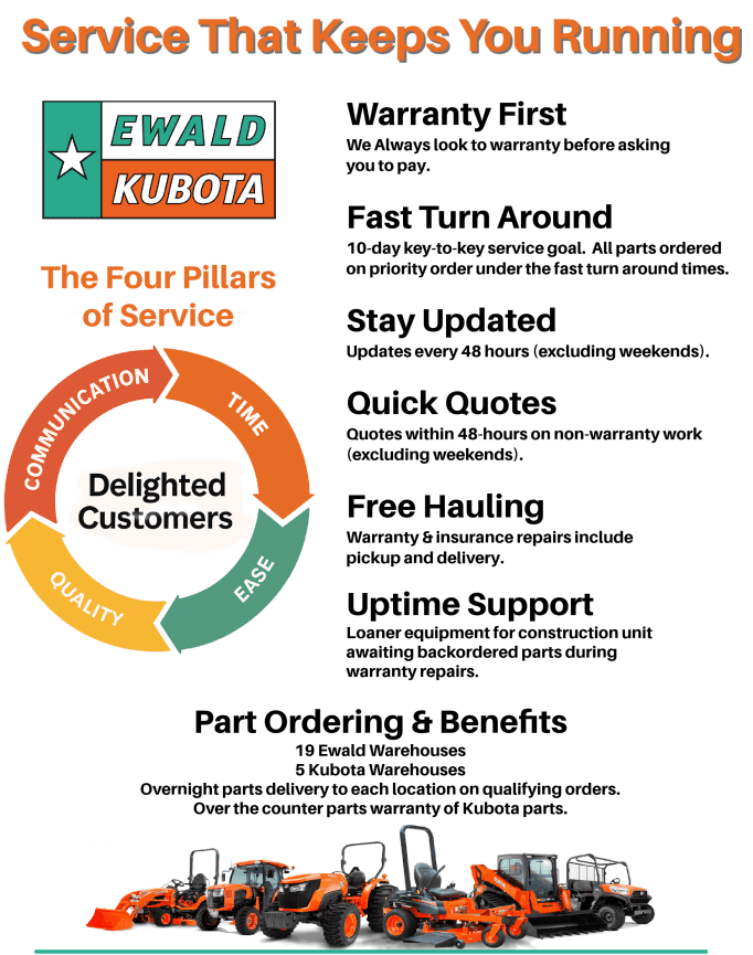 Lost time costs money. That's why we provide free pickup and delivery for Kubota Warranty and KTAC insurance repairs.